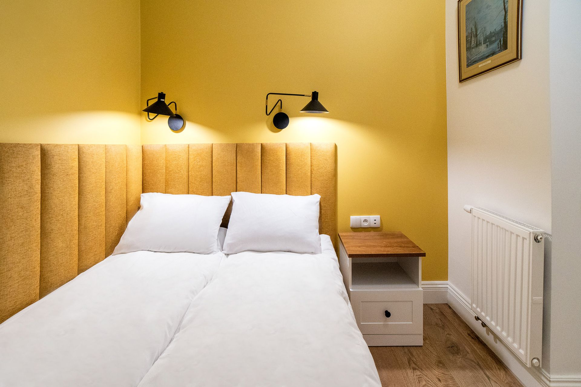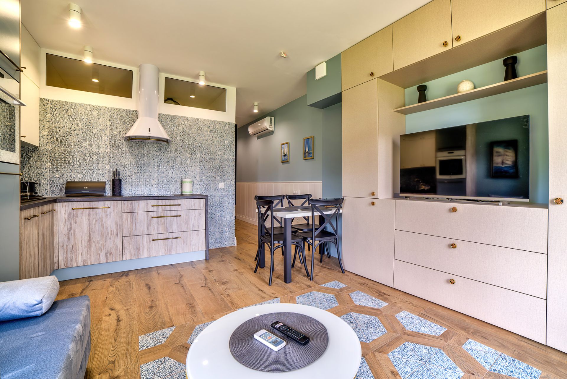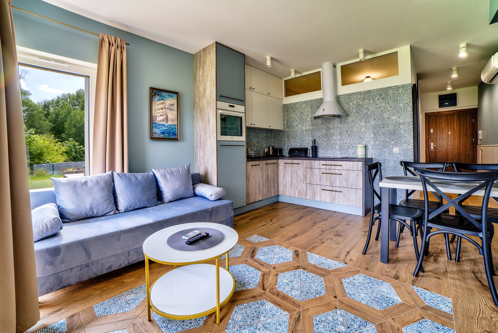 Apartament znajduje się na parterze, ma urządzony taras i ogródek, jedną przytulną, niedużą sypialnię z wygodnym dwuosobowym łóżkiem oraz salon z rozkładanym narożnikiem, w pełni wyposażoną kuchnią.